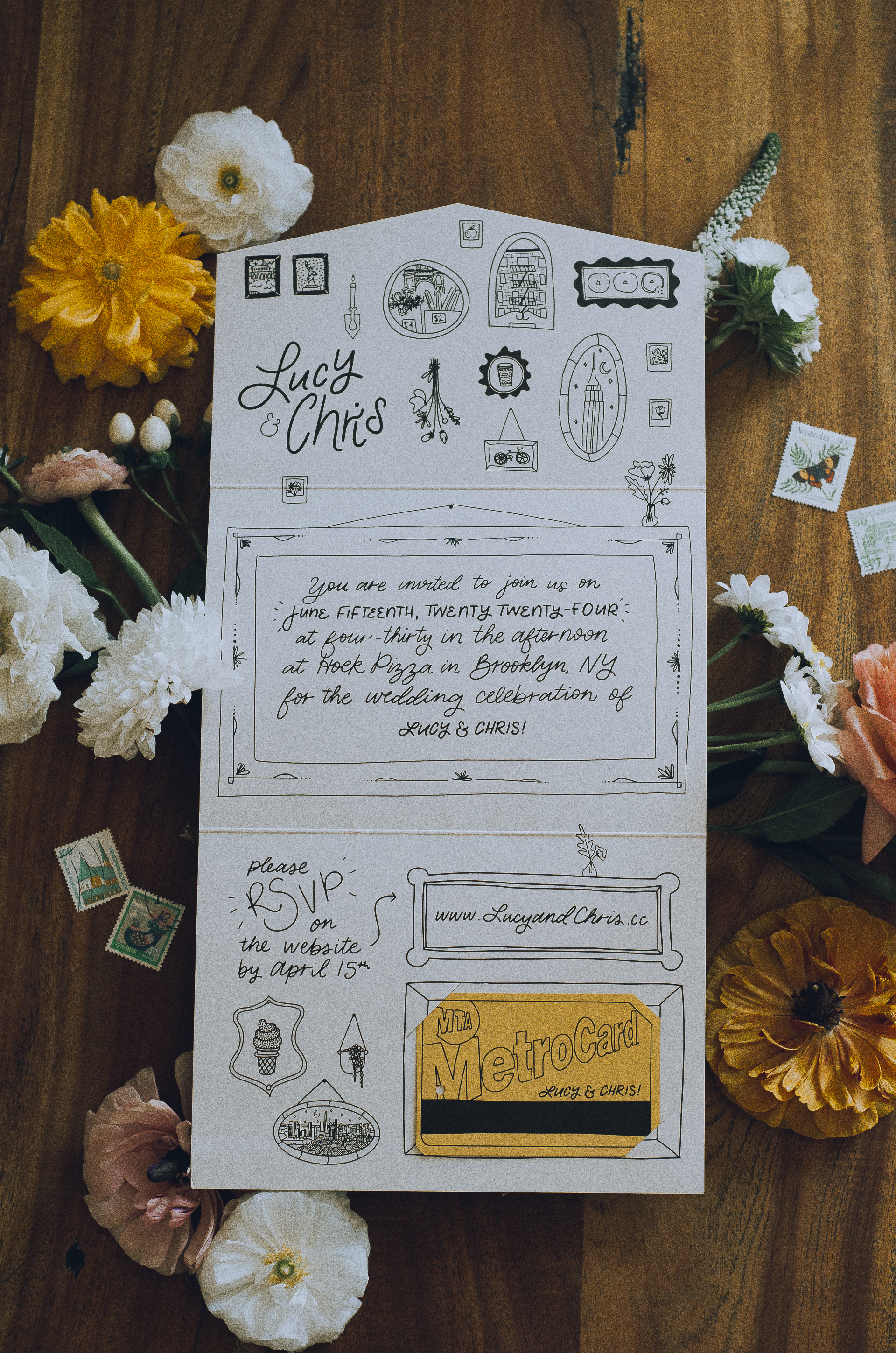 From the outset, Lucy & Chris wanted their invitations to be playful and unique, reflecting their love story and the vibrant energy of their Brooklyn wedding. We started with hand-drawn illustrations, incorporating elements that were meaningful to them. Each piece, from the save-the-date to the trifold invitation, was crafted with whimsy and fun.