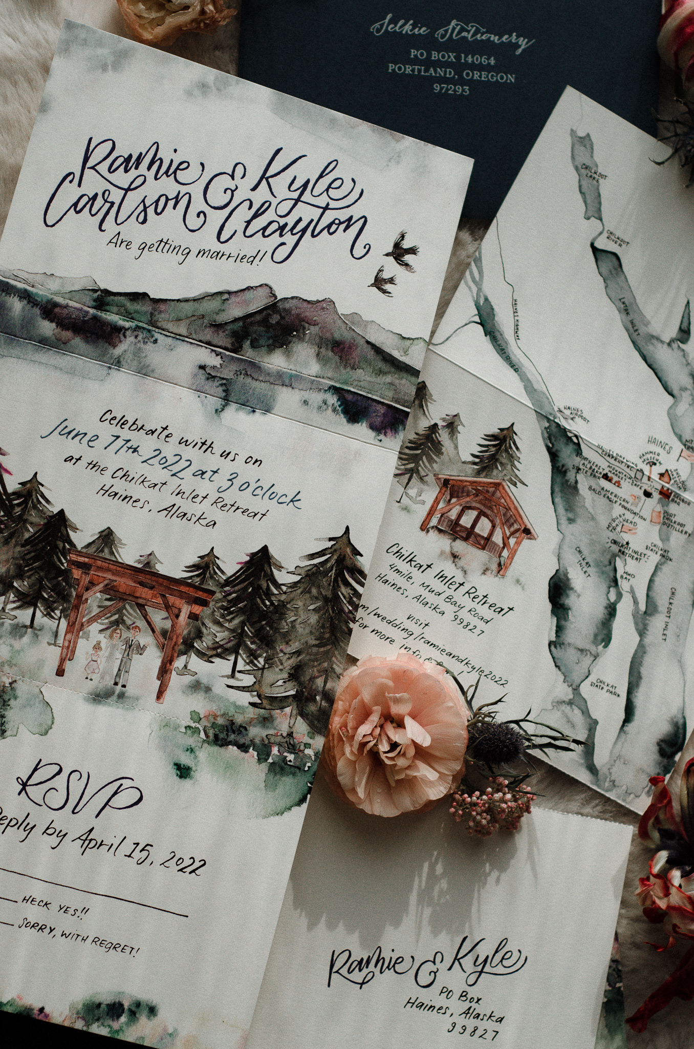 Just getting dreamy over here with this Alaskan watercolor trifold invitation. All watercolor designs are based from views and structures from the beautiful Chilkat Inlet Retreat.